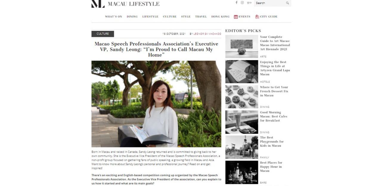 Born in Macau and raised in Canada, Sandy Leong returned and is committed to giving back to her own community. She is the Executive Vice President of the Macao Speech Professionals Association, a non-profit group focused on gathering fans of public speaking, a growing field in Macau and Asia. Want to know more about Sandy Leong’s personal and professional journey? Read on and get inspired!