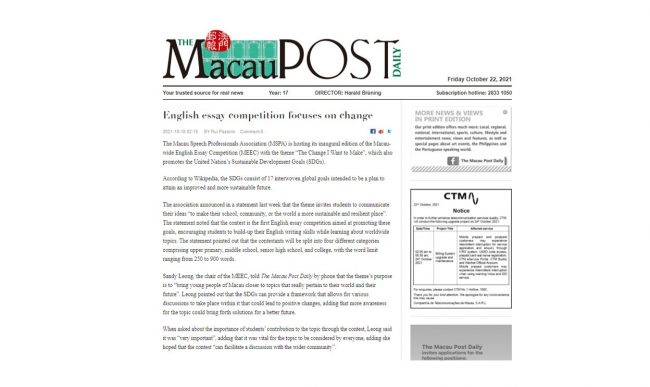 2021年10月13日 【澳門日報】 澳門演講專業協會主辦,聯合國可持續發展解決方案青年網絡香港地區分會擔任指導單位,澳門食物及環境健康學會、澳門多元化發展促進會、澳門第三產業促進會及可持續發展協會協辦“全澳英文徵文比賽”由即日起至本月二十二日接受報名。作為澳門首個面向青少年,以聯合國的十七個可持續發展目標為核心的英文寫作比賽,旨在提升澳門學生對全球社會事務的理解以及解難能力,提高英文寫作水平,歡迎本澳學生參加。