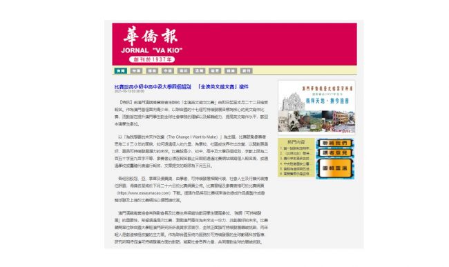 2021年10月13日 【華僑報】 由澳門演講專業協會主辦的「全澳英文徵文比賽」由即日起至本月二十二日接受報名。作為澳門首個面向青少年,以聯合國的十七個可持續發展目標為核心的英文寫作比賽,活動旨在提升澳門學生對全球社會事務的理解以及解難能力,提高英文寫作水平,歡迎本澳學生參加。